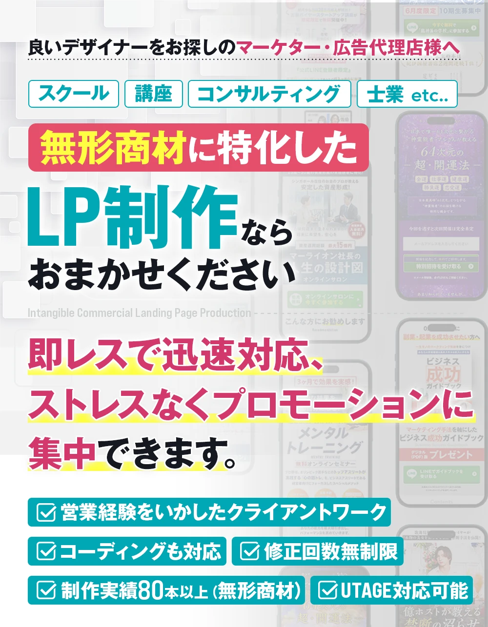 無形商材に特化しているので、デザインの意図や原稿の理解がスムーズにできます。オプトイン、セールスレター、VSL(ビデオセールスレター)といった業界用語も説明が不要です。実績数も80件以上ありますので、安心してご発注ください。